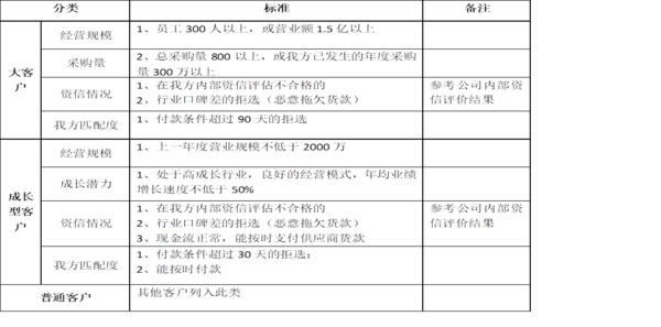 (4) 建立深圳市譽恒達科技有限公司客戶分類分級標準,具體標準如下: