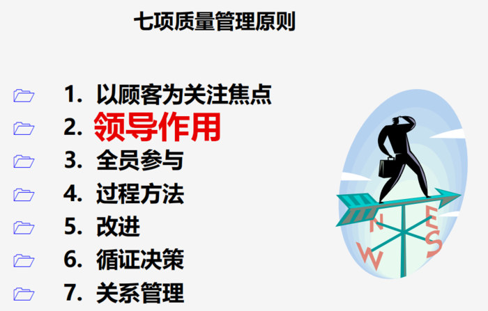領(lǐng)導(dǎo)作用是指各級(jí)領(lǐng)導(dǎo)建立統(tǒng)一的宗旨和方向,并且創(chuàng)造全員積極參與的環(huán)境,以實(shí)現(xiàn)組織的質(zhì)量目標(biāo)。