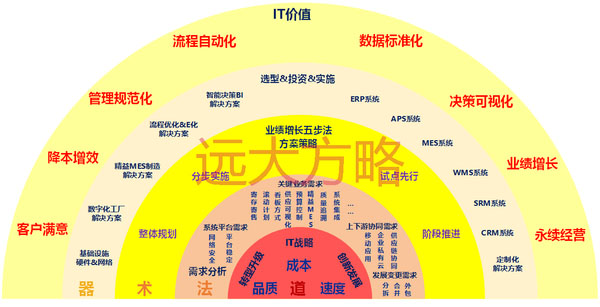 遠大方略智能制造信息化運用管理咨詢作為實施系統的指導思想,軟件為核心技術,為中國中小實體企業提供量身定制的行業解決方案,實現企業的策略:創新、速度、效率、品質、成本