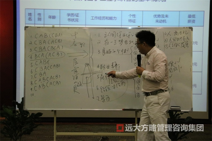 當制定了戰略規劃以后,張老師跟我們探討了如何招聘人才以及引進的體系,指出我們要招既有意愿也有能力的人走進我們的企業,選擇什么樣的人才很重要,應該考慮哪些因素?如是否具有良好的職業素養、學習能力如何、個人能力又如何、有何經驗等等。人崗匹配、人和組織匹配、人和組織發展匹配,對于企業來說哪一個更重要?重要性順序不同,面試中考察的重點也不同。企業應根據自身需求,考察人才的核心競爭力。