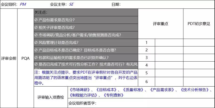 評審過程需要有人負(fù)責(zé),一般來講系統(tǒng)工程師是技術(shù)指導(dǎo)者,PQA是過程主持人, PDT核心組成員反映部門問題,代表本領(lǐng)域提出專業(yè)意見,并代表功能部門承擔(dān)責(zé)任,項目領(lǐng)導(dǎo)以業(yè)務(wù)需要為出發(fā)點(diǎn)對技術(shù)問題做決策。