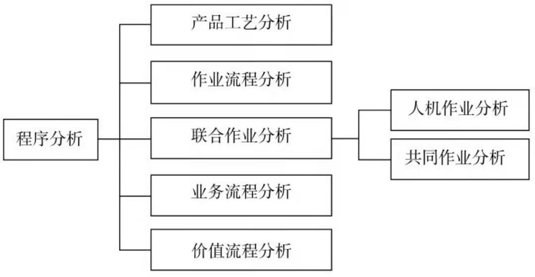 程序分析按分析對(duì)象不同,分為以產(chǎn)品工藝為中心的產(chǎn)品工藝分析和以人為中心的作業(yè)流程分析,同時(shí)為表達(dá)操作者與機(jī)械之間的作業(yè)程序或多名操作者之間的作業(yè)程序,又有聯(lián)合作業(yè)分析。其中聯(lián)合作業(yè)分析又因作業(yè)的對(duì)象不同分為作業(yè)人員分析法和共同作業(yè)分析法。
