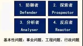 雷蒙德·邁爾斯(Raymond Miles)和查爾斯·斯諾(Charles Snow)在1978年《組織戰(zhàn)略、結(jié)構(gòu)和方法》(Organization Strategy, Structure, and Process)一書中認(rèn)為, 企業(yè)戰(zhàn)略并不是取決于組織的類型或風(fēng)格,而是取決于那些需要戰(zhàn)略解決的基本性問題:
