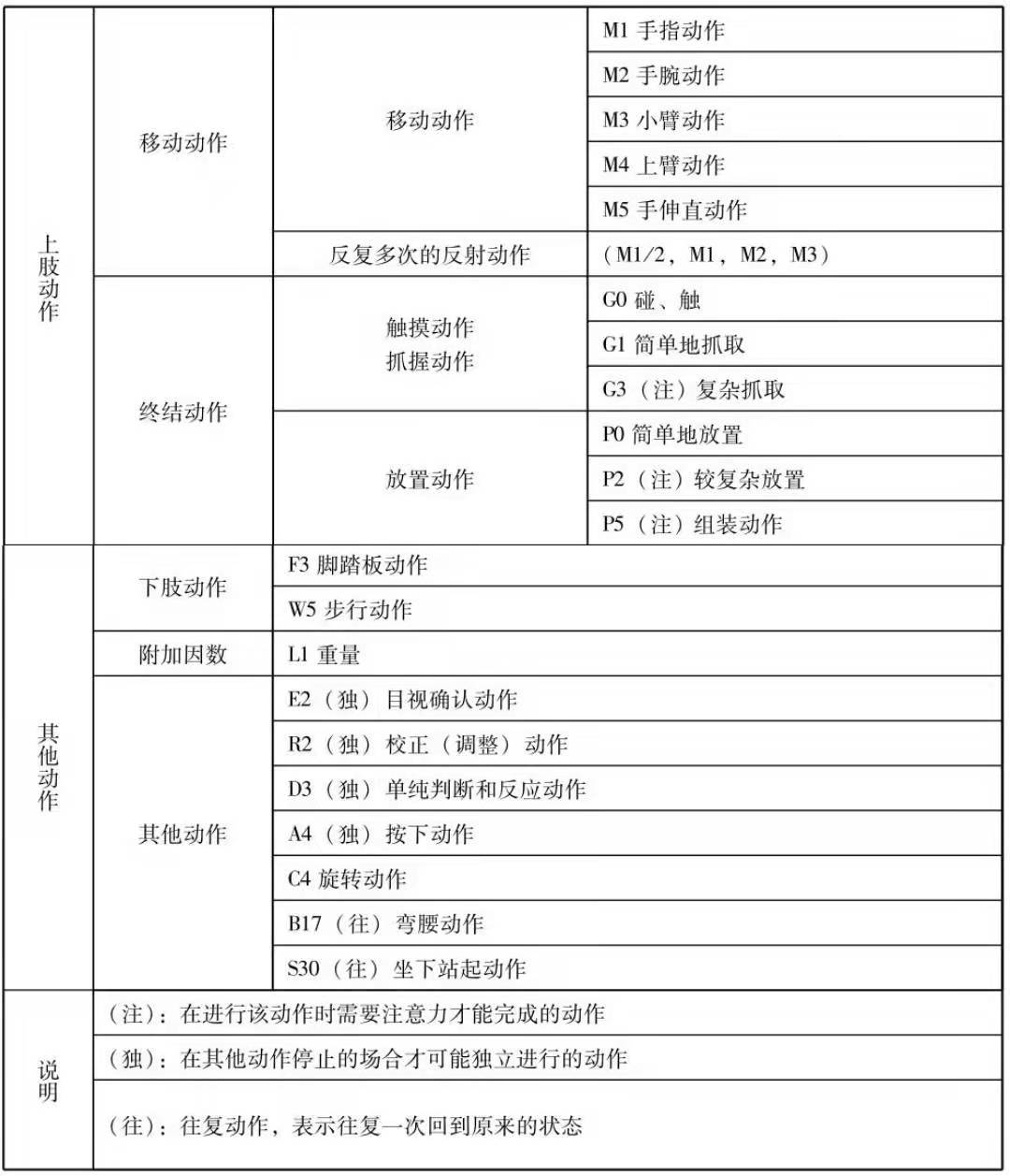 (3) 如同WF法一樣,MODAPTS法的動(dòng)作也是由人體器官有限的幾個(gè)部位在適合的距離、重量情況下所能完成的動(dòng)作構(gòu)成。