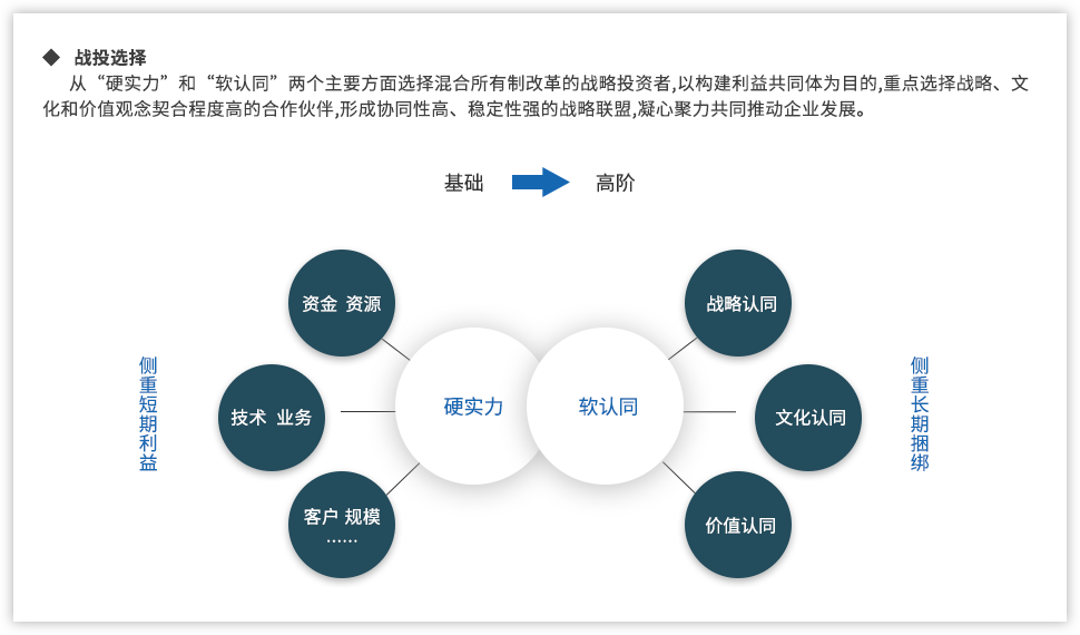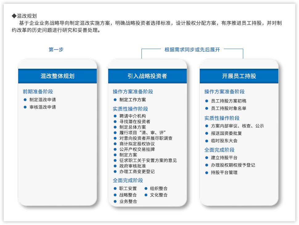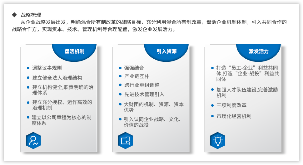 黨的十九大報告指出:“要深化國有企業改革,發展混合所有制經濟,培育具有全球競爭力的世界一流企業”;當前,隨著國企改革“雙百行動”、區域性國資國企綜合改革試驗、“科改示范行動”、第三批以及第四批混改試點的實施,國企改革由點向面梯次鋪開、范圍逐步擴大,并呈現明顯加速,國有企業改革進入“深水區”。追本溯源,國企改革到底怎么改,回到國有企業改革的初衷我們認為,國有企業改革是以混和所有制為手段,在堅持黨的領導下建立現代企業制度,優化管理關系,創新管理機制,激發員工活力,從而最終實現國有企業的持續發展?;旄穆鋵嵉骄唧w實踐中,便處處是難點。遠大方略認為,混改的重點已經從以“政策研究+方案制定”為主轉變到以化解落地過程中的實際痛點為主,從剖析“為什么混、和誰混、怎么混”轉變為落實治理結構、戰略協同以及激勵機制等深層次問題。