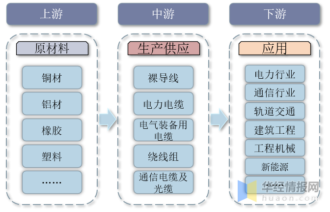 電線電纜行業產業鏈上游主要為銅材、鋁材、橡膠、塑料等原材料;中游為電線電纜生產供應環節,主要產品包括裸導線、電力電纜、電氣裝備用電纜、繞線組、通信電纜及光纖;下游廣泛應用于電力、通信、軌道交通、建筑工程、工程機械、新能源等領域。
