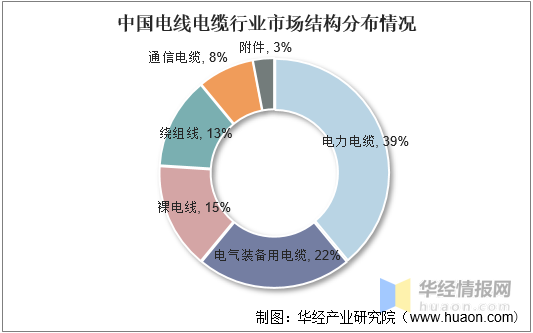 從我國電線電纜市場結構來看,目前,電力電纜是行業市場占比最大的細分領域,占比達39%,其次為電器裝備用電纜和裸電線,占比分別為22%和15%。