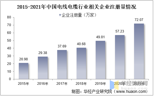 隨著我國電線電纜行業的快速發展,行業新增企業數量不斷增長。據資料顯示,截至2021年底,我國電線電纜行業相關企業注冊量達72.07萬家,同比增長25.9%。