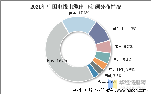 從出口分布情況來看,2021年我國電線電纜出口金額中,占比前三的地區分別為美國、中國香港及越南,占比分別為17.6%、11.3%和6.3%。