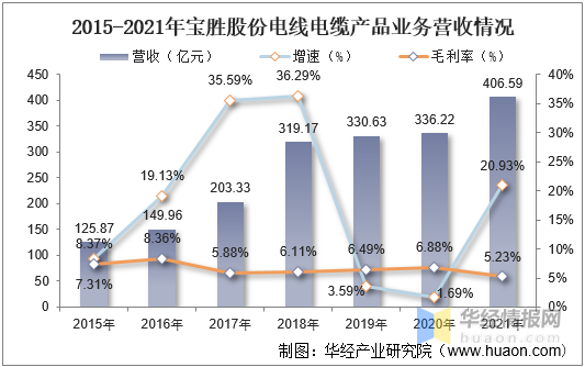 寶勝科技創新股份有限公司(簡稱寶勝股份)是中國航空工業集團公司旗下的上市公司,公司主要從事電線電纜及電纜附件開發、制造、銷售及相關的生產技術開發。公司產品覆蓋裸導體、電氣裝備用電纜、電力電纜、通信電纜及光纜等,是我國電線電纜行業主要龍頭企業之一。據資料顯示,2021年寶勝股份電線電纜產品業務營收為406.59億元,同比增長20.93%,毛利率為5.23%。