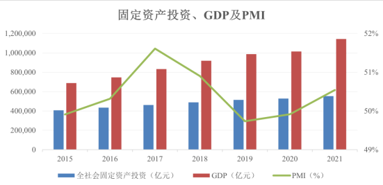 在供需改善的背景下,國內(nèi)制造業(yè)景氣度自 2015 年底起觸底回升。同時中國工業(yè)企業(yè)設(shè)備能力利用水平、固定資產(chǎn)投資情況自 2016 年開始穩(wěn)步增長,制 造業(yè)景氣度繼續(xù)上行。2020 年受新冠疫情影響,GDP 增速大幅下降,PMI 小幅提高。2021 年在疫情防控常態(tài)化下,內(nèi)需穩(wěn)步恢復、外貿(mào)快速增長,GDP 增速重回高位,PMI 上升至榮枯分水線之上,顯示出經(jīng)濟擴張的訊號。