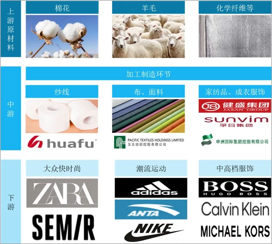 紡織業的上游原材料包括棉花、羊毛、化學纖維等,中游是紡織行業的加工及制造環節,下游產業主要有服裝業、家用紡織品、產業用紡織品等。