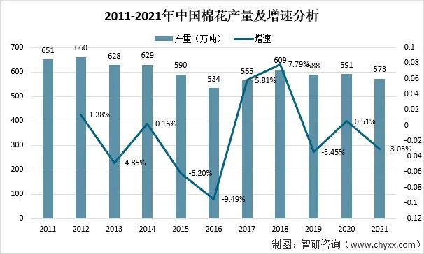 2021年,受種植效益和種植結構調整等因素影響,種植面積降幅較大,帶動中國整體棉花種植面積及產量下降。全國棉花總產量573萬噸,比2020年減少18萬噸,下降3.05%。