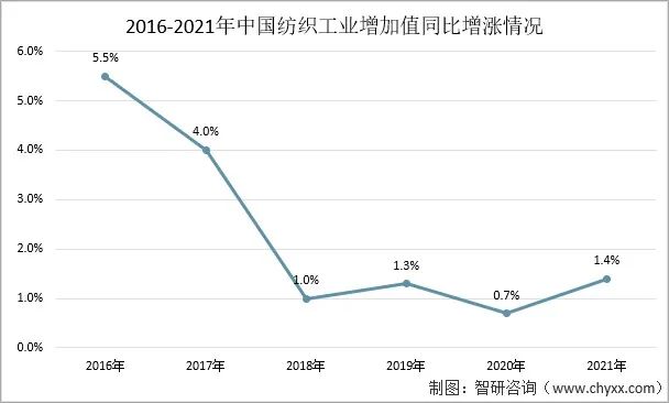 從紡織工業增加值來看,2016年-2021年中國紡織工業在穩定增漲。2021年中國紡織工業增加值同比增漲1.4%。