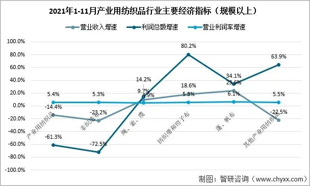 2021年1-11月產業用紡織品行業規模以上企業的營業收入同比下降14.4%,利潤總額同比下降61.3%,營業利潤率為5.4%。非織造布行業的營業收入和利潤總額分別同比下降23.2%和72.5%,營業利潤率為5.3%。繩、索、纜行業的營業收入和利潤總額分別同比增長9.7%和14.2%,營業利潤率為4.9%。紡織帶和簾子布市場延續了良好的發展勢頭,營業收入和利潤總額分別同比增長18.6%和80.2%,營業利潤率達到5.3%。篷、帆布的營業收入和利潤總額分別同比增長23.6%和34.1%,6.1%的營業利潤率為行業最高。醫療衛生、過濾、土工用紡織品所在的其他產業用紡織品的營業收入和利潤總額分別同比下降22.5%和63.9%,營業利潤率為5.5%。