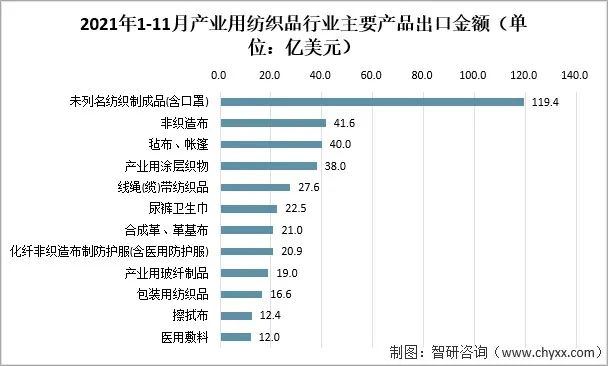 根據中國海關數據,2021年1-11月我國產業用紡織品主要出口產品(按出口金額排名前十二類產品)的出口額為391.1億美元,同比下降53.0%。分產品來看,未列名紡織制成品(主要為口罩)目前是行業最大的出口產品,出口金額為119.4億美元,但因國外對口罩需求的大幅回落其出口額較上年同期下降了77.0%;氈布/帳篷、產業用涂層織物等傳統產品的出口額分別為40.0億美元和38.0億美元,同比增長52.7%和33.6%;合成革及革基布的出口額為21.0億美元,同比增長44.7%。非織造布及相關制品的出口呈現不同走勢,卷材出口41.6億美元,同比下降9.0%,出口量126.0萬噸,同比小幅上漲0.8%,出口均價同比下滑9.8%;化纖非織造布制防護服(含醫用防護服)出口20.9億美元,同比下降80.2%;一次性衛生用品出口22.5億美元,同比增長10.5%。