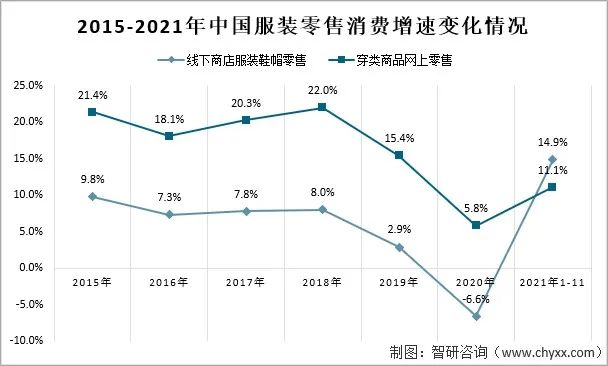 根據國家統計局數據,1~11月,實體商店服裝鞋帽類商品零售總額同比增長14.9%,穿類商品網上零售額增長11.1%,雖然國內消費市場受疫情多點散發等因素影響,11月當月服裝商品零售額略有下降,降幅環比收窄,但實體與網絡服裝零售兩年平均增速持續較快增長,國內消費整體的復蘇態勢并未變化。