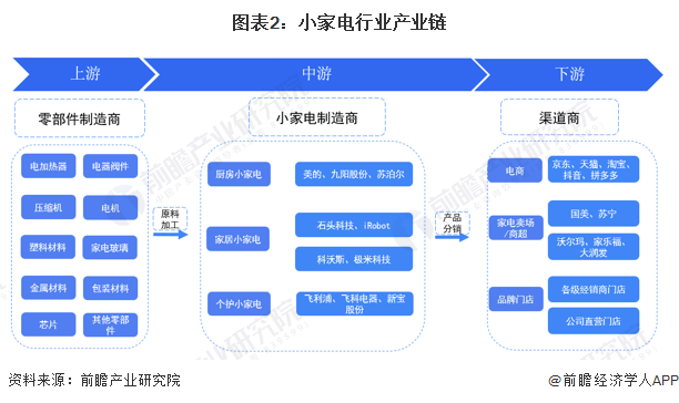 小家電產業鏈主要分為上游原材料和零部件供應、中游小家電制造和下游小家電銷售三大環節。小家電行業上游原材料和零部件包括電加熱器、電器閥件、塑料、金屬材料、包裝材料等各類零部件供應商,由于各種不同小家電所需原材料零部件不同,因此上游覆蓋企業范圍較廣,品牌也較多元化;中游小家電制造企業包含了國外大企業(如飛利浦)和國內家電綜合制造企業(如美的)、小家電制造企業各類型企業;下游主流銷售渠道有綜合電商平臺(如天貓商城、京東商城等)、線下家電賣場(如蘇寧、國美)、大型商超、各級經銷商門店、公司直營門店等各類分銷渠道。
