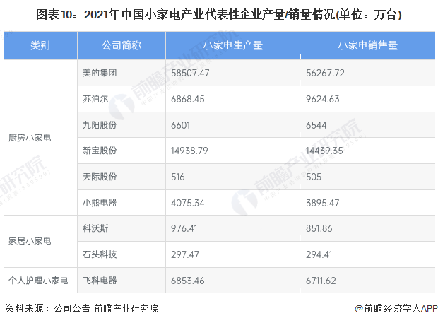 2021年,布局了小家電制造的上市企業中,美的集團、蘇泊爾、九陽股份、新寶股份、小熊電器、飛科電器的企業產量均在4000萬臺以上,規模較大,其中美的集團家電產品產量達到5.85億臺,產量規模位居全國第一。從產銷率來看,多數企業基本達到產銷平衡的狀態,蘇泊爾呈現供不應求的局面,其部分產能需要通過代工方式進行補充。小家電產業的代表性企業產量/銷量情況如下: