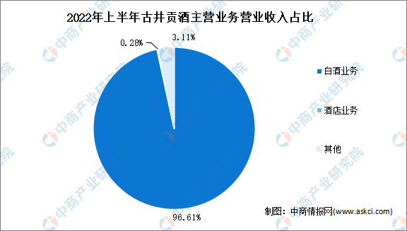 從主營業務來看,2021年古井貢酒主營白酒業務、酒店業務,營業收入占比分別為96.61%、0.28%。