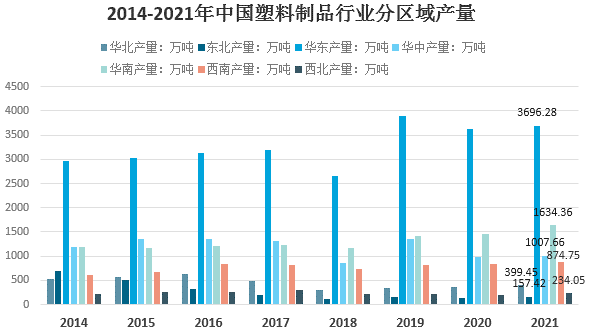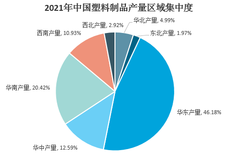 從生產的區域分布來看,國內塑料制品生產集中在華東、華南、華中地區。2021年,華東地區塑料制品產量3696.28萬噸,占全國的比重為46.18%。華南地區發展迅速,塑料制品產量1634.36萬噸,占比20.42%。華中地區塑料制品產量1007.66萬噸,占比12.59%。其他地區塑料制品產量均在千萬噸以下,其他地區合計占比20.81%。