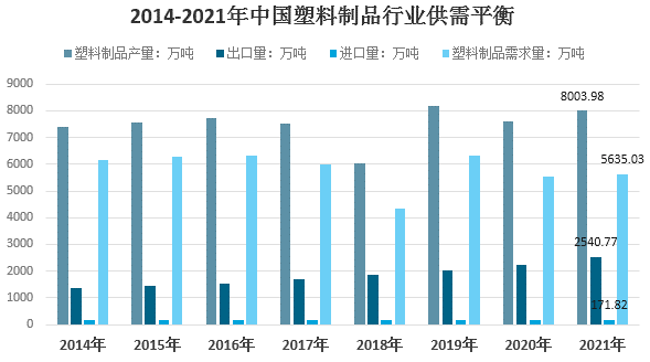 根據海關數據,2021年我國塑料制品行業進口171.82萬噸,出口2540.77萬噸,結合國內產量來看,2021年我國塑料制品行業表觀需求量達到5635.03萬噸。