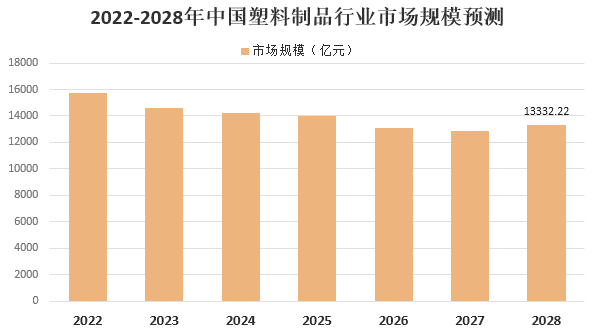 在政策限制下,傳統石化塑料制品行業將逐步收縮,預計2028年我國塑料制品市場規模下降至13332.22億元,行業未來幾年市場規模發展趨勢預測情況如下: