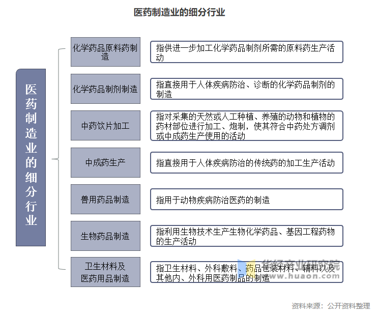 2、細分行業:醫藥制造業具體可以細分為化學藥品原料藥制造、化學藥品制劑制造、中藥飲片加工、中成藥生產、獸用藥品制造、生物藥品制造和衛生材料及醫藥用品制造七個行業。我國醫藥制造企業是指以藥品研發、生產及銷售為主的企業。根據具體藥品生產業務線的不同,《中國高技術產業統計年鑒》將我國醫藥制造業分為三大種類:化學藥品制造、生物藥品制造和中成藥制造。