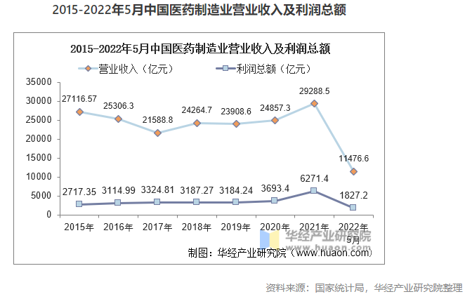 2016年,醫藥制造業由于受到一系列政策調控和企業轉型的影響,藥品價格受到嚴格監管和控制,行業整體營業收入出現下滑,隨后市場競爭環境改善,營業收入逐漸恢復增長趨勢,2021年中國醫藥制造業的營業收入為29288.5億元,利潤總額為6271.4億元,利潤率為21.4%,截至2022年5月,我國醫藥制造業2022年利潤率為15.9%。