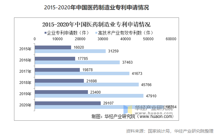 作為技術含量最高的行業之一,醫藥制造業必須不斷投入新藥品的研發,提升行業整體創新能力和研發水平,才能提高醫藥制造業的競爭力。根據國家統計局數據顯示2020年我國醫藥制造業企業專利申請數為29107個,高技術產業專利有效數56784件,同比增長18.7%