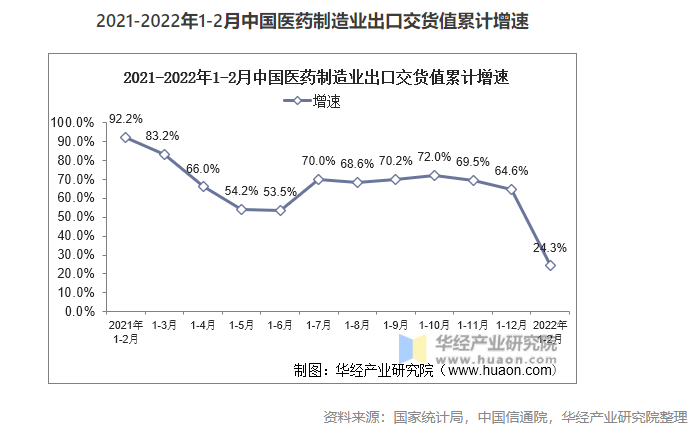 出口交貨值保持較快增長態勢。受海外疫情持續爆發影響,防疫物資產品出口需求強勁,支撐醫藥制造業出口保持較快增長。截至2022年1-2月,醫藥制造業出口交貨值同比增長24.3%,在去年高基數的情況下繼續保持高速增長,較工業平均水平高7.4個百分點