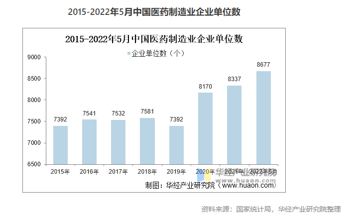 疫情前,受政策控制和行業嚴格監管的影響,我國醫藥制造業企業單位數量較為穩定,研發能力較弱的中小型企業逐漸退出市場,2020年疫情席卷全球,市場迫切需要大量藥品和疫苗研發,企業數量開始增長,截止2022年5月我國醫藥制造業企業有8677家。