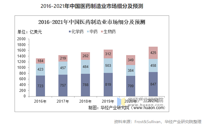 醫藥制造業三大種類中,化學藥的市場占比最多,化學藥主要用于人體疾病防治、診斷。應用領域較為廣泛和普及,2020年我國化學藥市場規模大709億美元,占比49.2%;生物藥憑借其藥理活性高、特異性強、治療效果好等特點,越來越受市場關注,其市場規模由2016年的184億美元增長至2020年的349億美元。慢性病的治療周期較長,我國中藥在慢性病的治療中具有不可替代的作用,2021年我國中藥制造企業規模預計為458億美元。