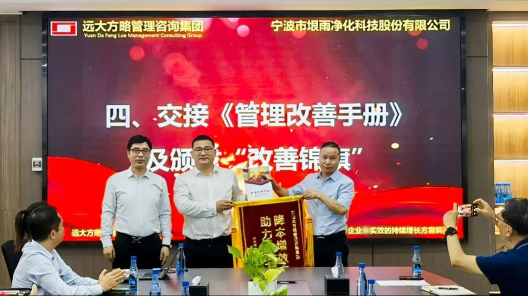 會上,遠大方略項目組與垠雨科技交接了《管理改善手冊》,林董向遠大方略授予了錦旗以表認可。