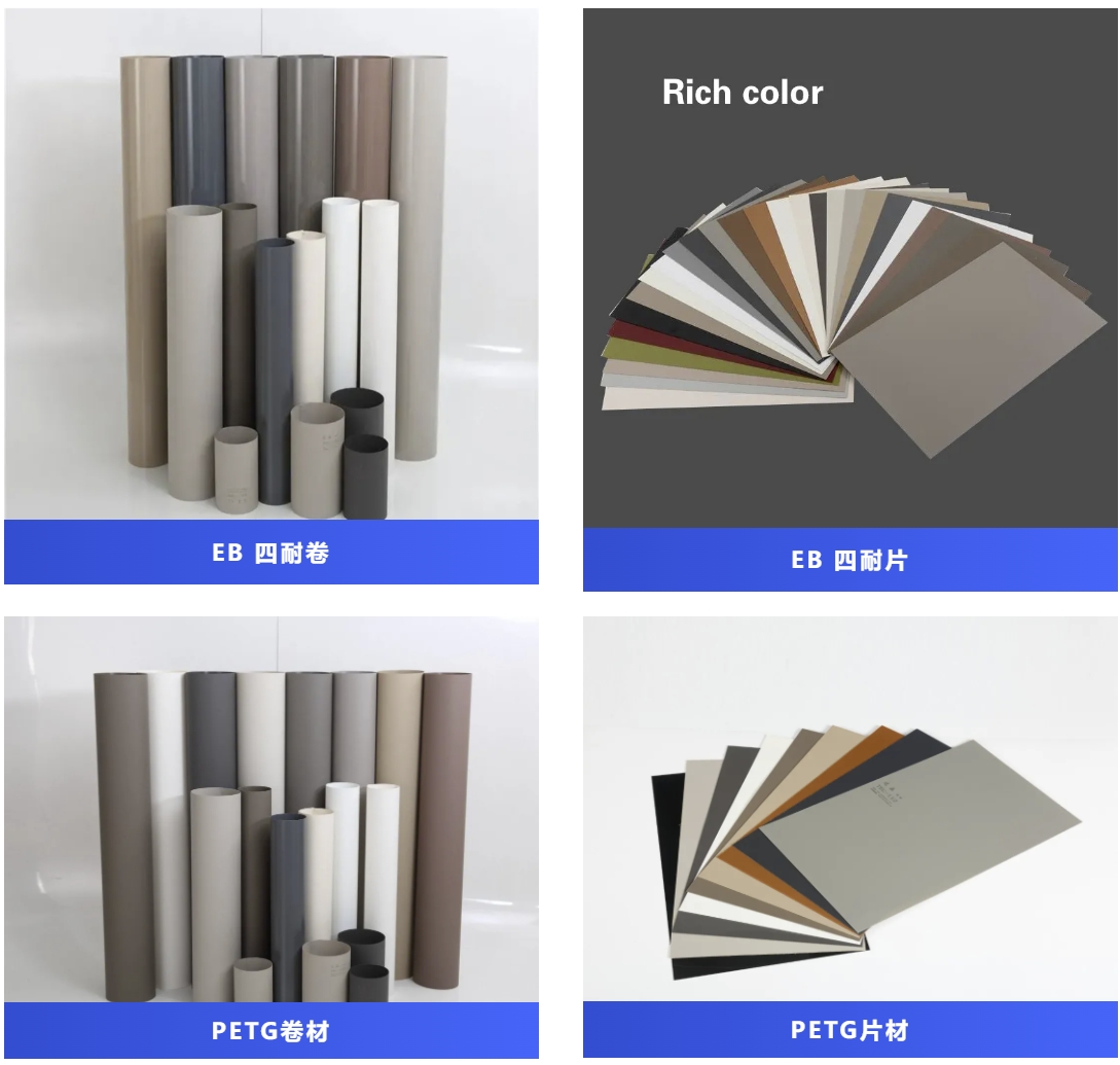 公司產品主要包括PETG膚啞卷材/片材、高光卷材/片材、EB 卷材/片材以及配套全系同色封邊條,產品性能表現出色,顏色穩定、高硬度、超耐磨、防劃花、抗指紋、熱修復、耐干熱、耐污染、耐灼燒、耐黃變。
