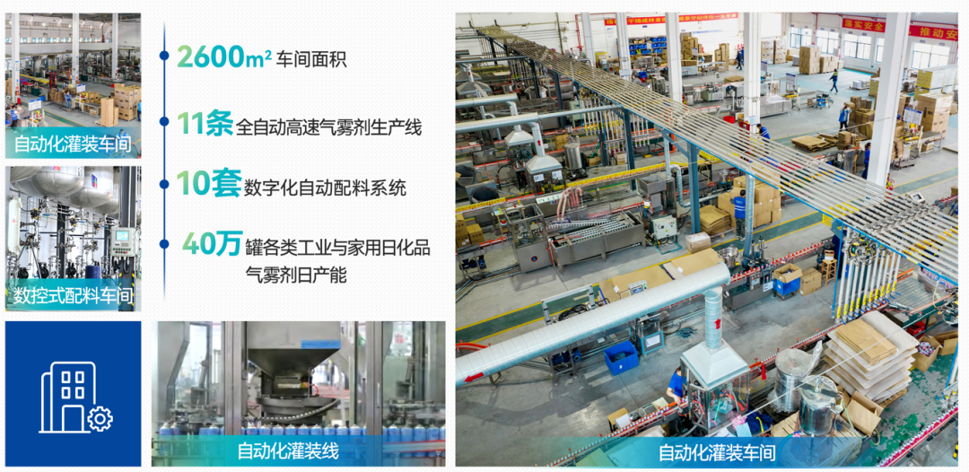 信鵬化工擁有甲、乙、丙類立體倉庫各一棟,2022 年投入落成 3600 平方米的專業級氣霧劑化妝品車間,符合 GMP 車間 10 萬級的潔凈度標準要求,同時搭配 4 條化妝品專用全自動氣霧劑充填生產線及乳化配料系統;公司擁有一支二十多年氣霧劑研發生產經驗的管理團隊, 技術和研發實力雄厚,為珠三角內為數不多的在化工園區內合規的專業氣霧劑制造基地;企業擁有自主進出口權,已取得危險化學品生產許可證、化妝品生產許可證、農藥生產許可證、ISO9001、ISO14001 質量管理體系,IATF16949、ISO22716體系、GMPC 等資質認證。