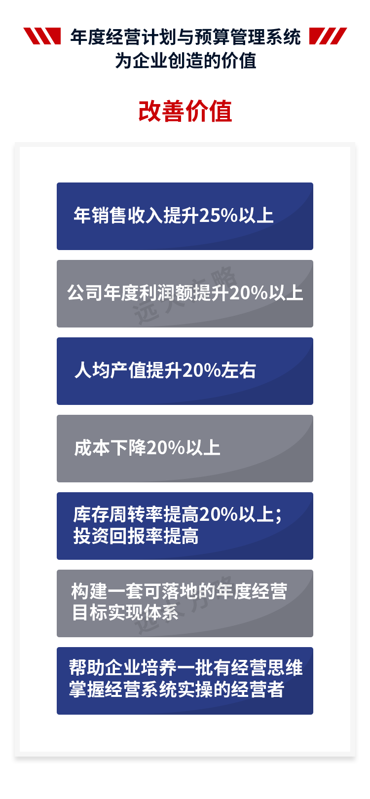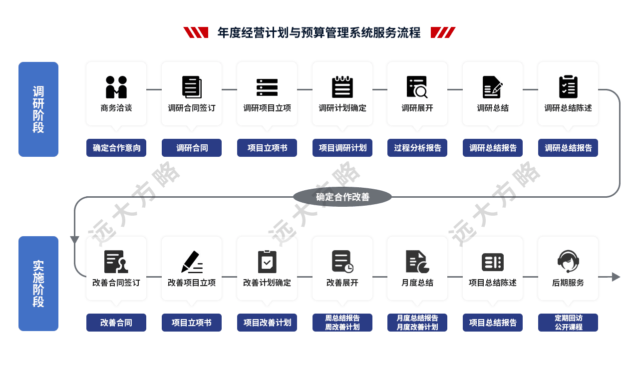遠(yuǎn)大方略始終遵循不了解不理解企業(yè)的前提下絕不輕易下結(jié)論,正式制定改善方案前必須深入到業(yè)務(wù)一線了解和理解企業(yè)的運(yùn)營情況。