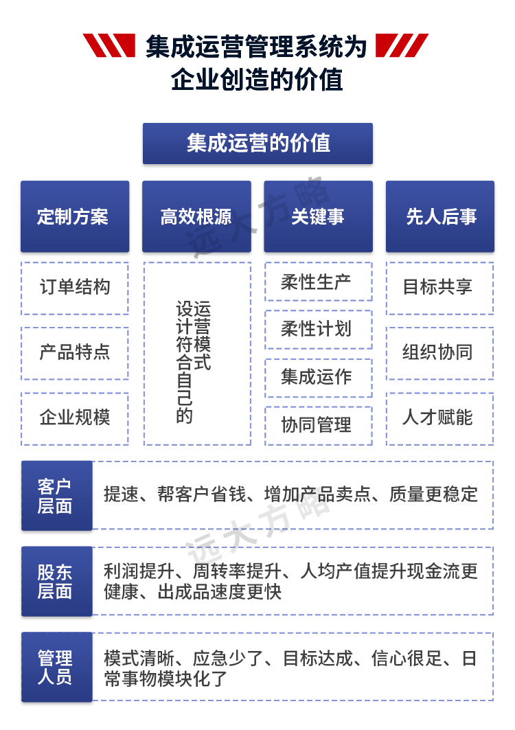 2、輔導模塊:推行卓越運營管理,主要從戰略規劃與經營計劃、組織架構優化與責權利系統構建、核心業務流程梳理、目標與數據信息體系構建、 自主運營體系構建等方面做改善
